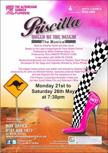 Priscilla Queen of the Desert, the wildly popular musical about two drag queens, a transgender woman and their race to get from Sydney to Alice Springs in time to perform their act at Lasseter’s Hotel Casino Resort, comes to the Altrincham Garrick next week.