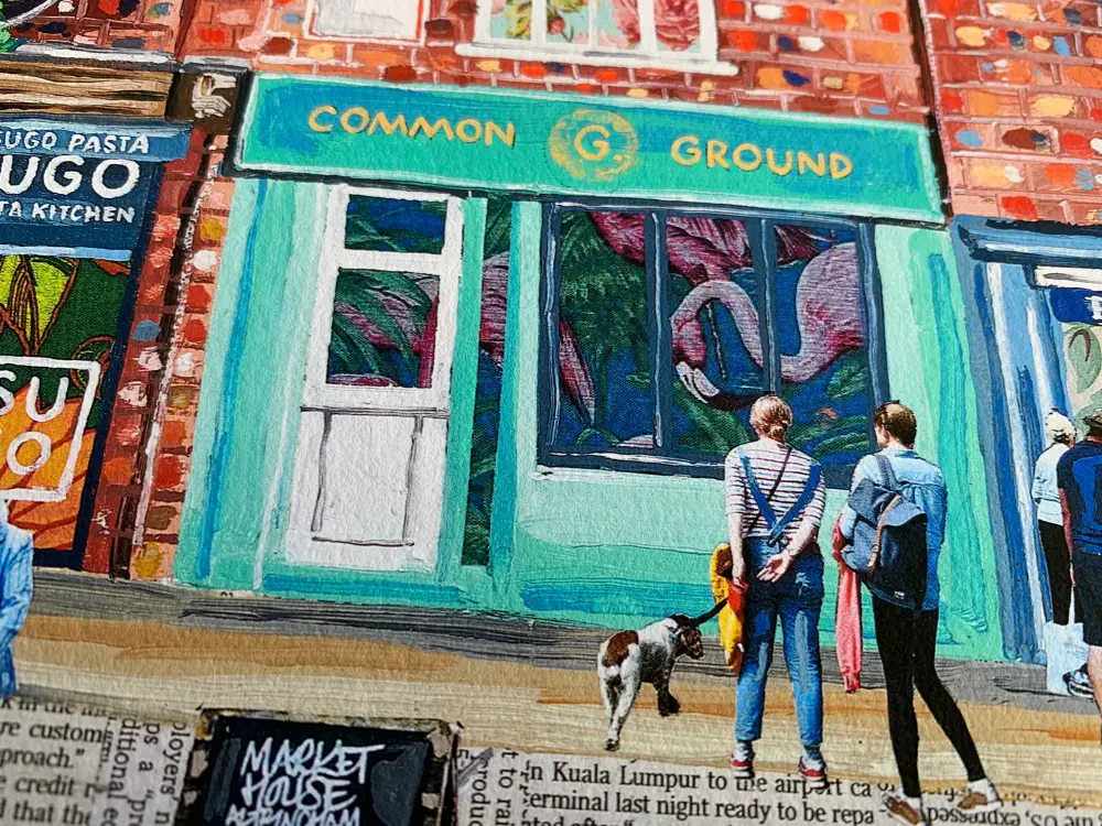 Her hugely popular and colourful style involves layering oil paints and combining with collage and photography. This particular print includes real-life local people.