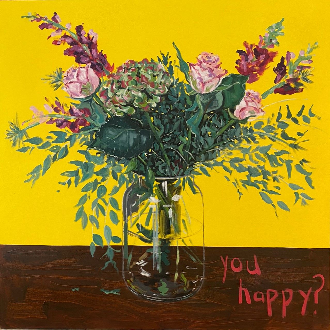 But in September 2022 she decided to diversify into a series of idiosyncratic flower paintings, many with slogans imagining what the flowers would be saying to the recipient.