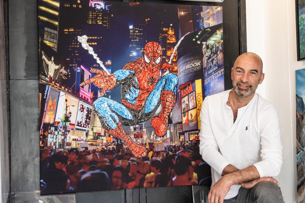 One that’s almost impossible to ignore as you enter the gallery is a large depiction of Spiderman in Time Square, but there are similarly striking works involving a butterfly, alsatian dog and lion.