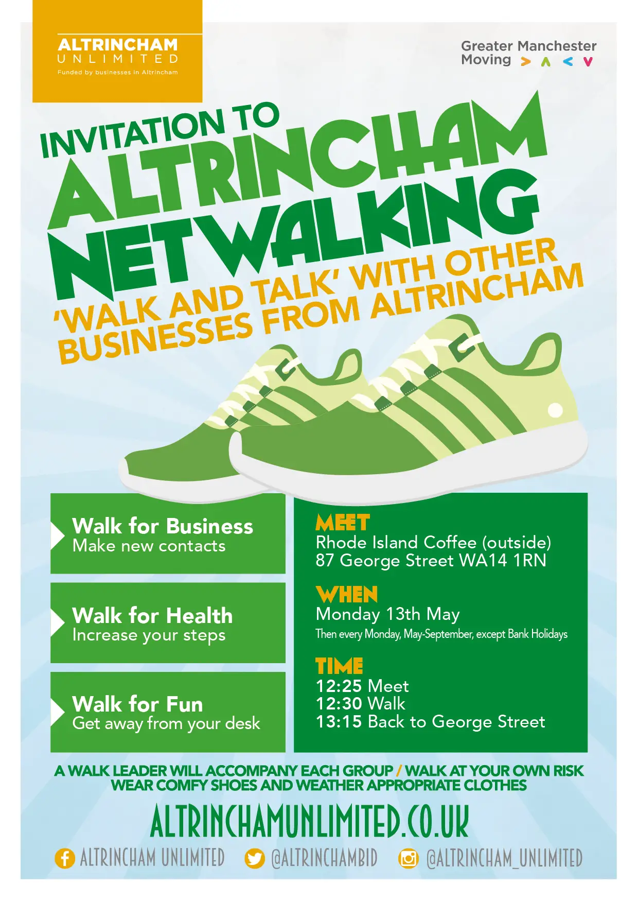 The benefits of walking for health and productivity are well known and ‘Netwalking’ will give workers a chance to ‘walk and talk’ while meeting other Altrincham-based businesses.