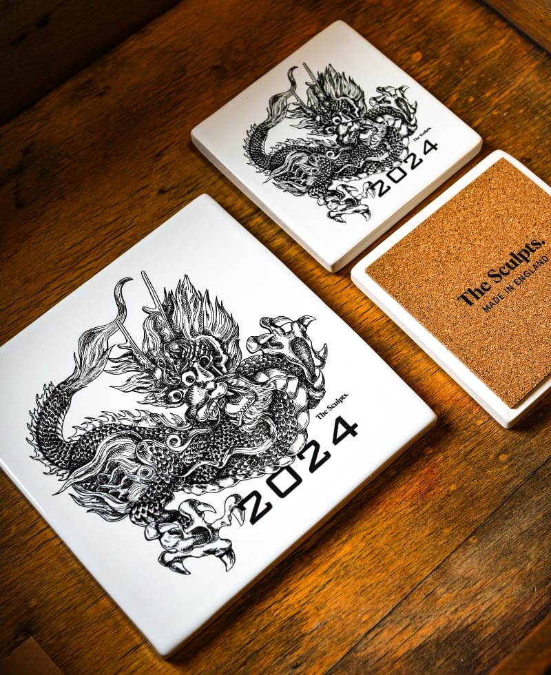 The limited edition dragon design is available as a decorative ceramic tile, a ceramic coaster or a print from The Sculpts.