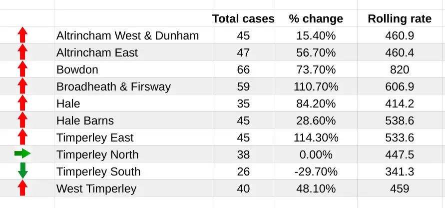 Elsewhere in the Altrincham area, rates also appear to be on a steep rise in Hale, parts of Timperley and Broadheath, although in other parts of Timperley the number of cases per 100,000 is down week-on-week for the seven days to January 5th.