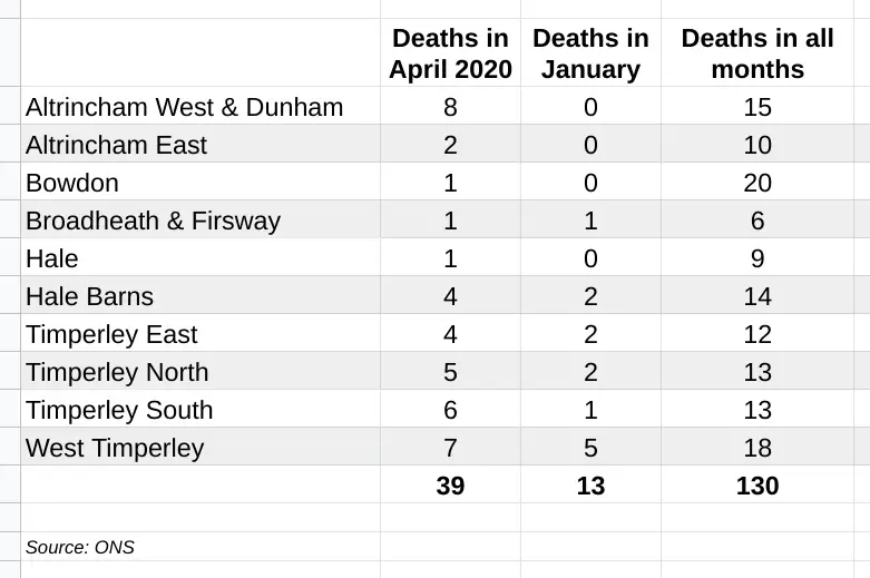 Overall, the figures show that coronavirus has now cost a total of 130 lives in the Altrincham area.
