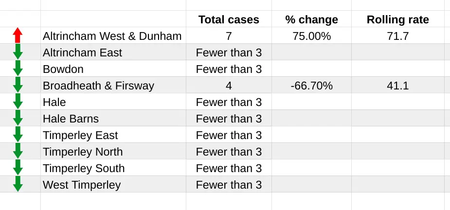 In the other two areas – Altrincham West & Dunham and Bowdon – there were just seven and four new cases respectively.