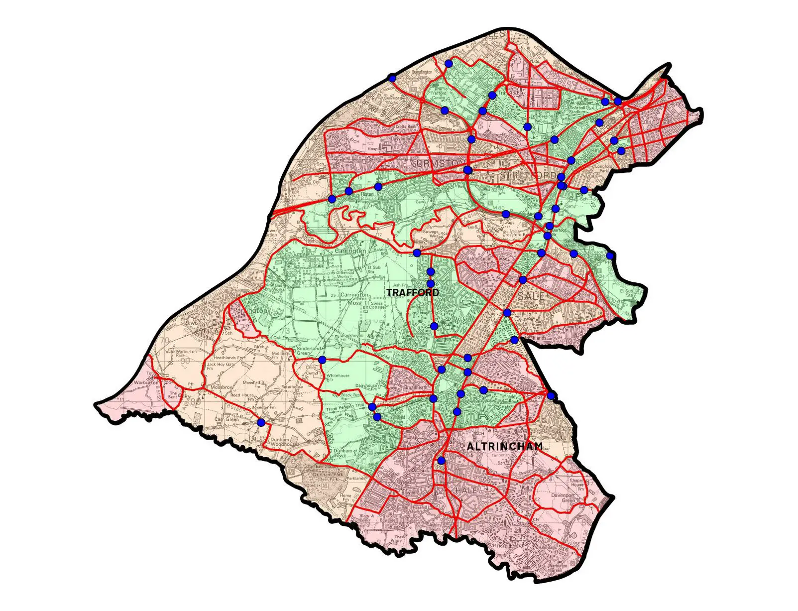 The ‘before’ and ‘after’ maps above and below show – down to street level – how the plans could take shape in Altrincham.