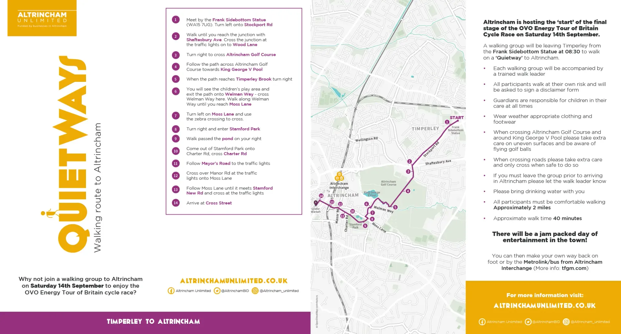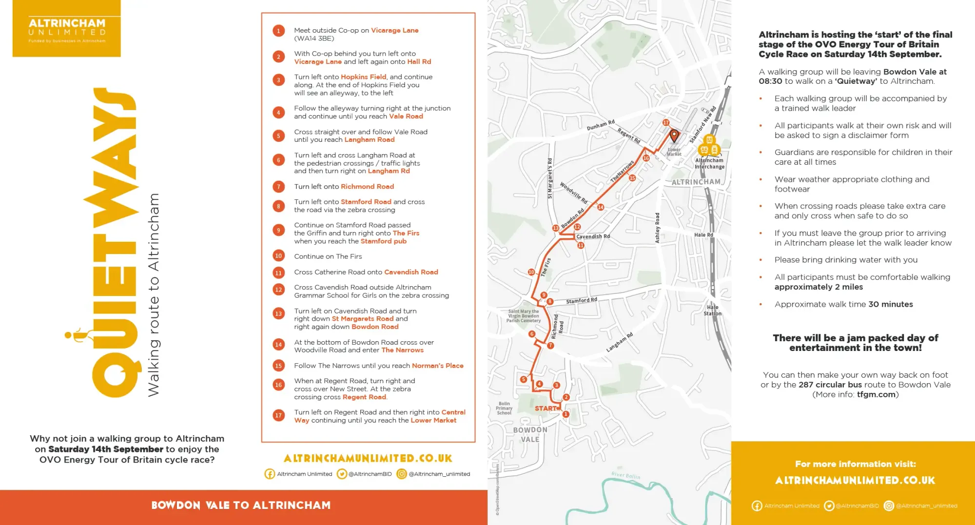 Each of the walks will set off on Saturday morning and arrive in Altrincham in time for the group to enjoy the start of the final stage of the OVO Energy Tour of Britain, followed by all of the events and activities which are happening in Altrincham on the day.