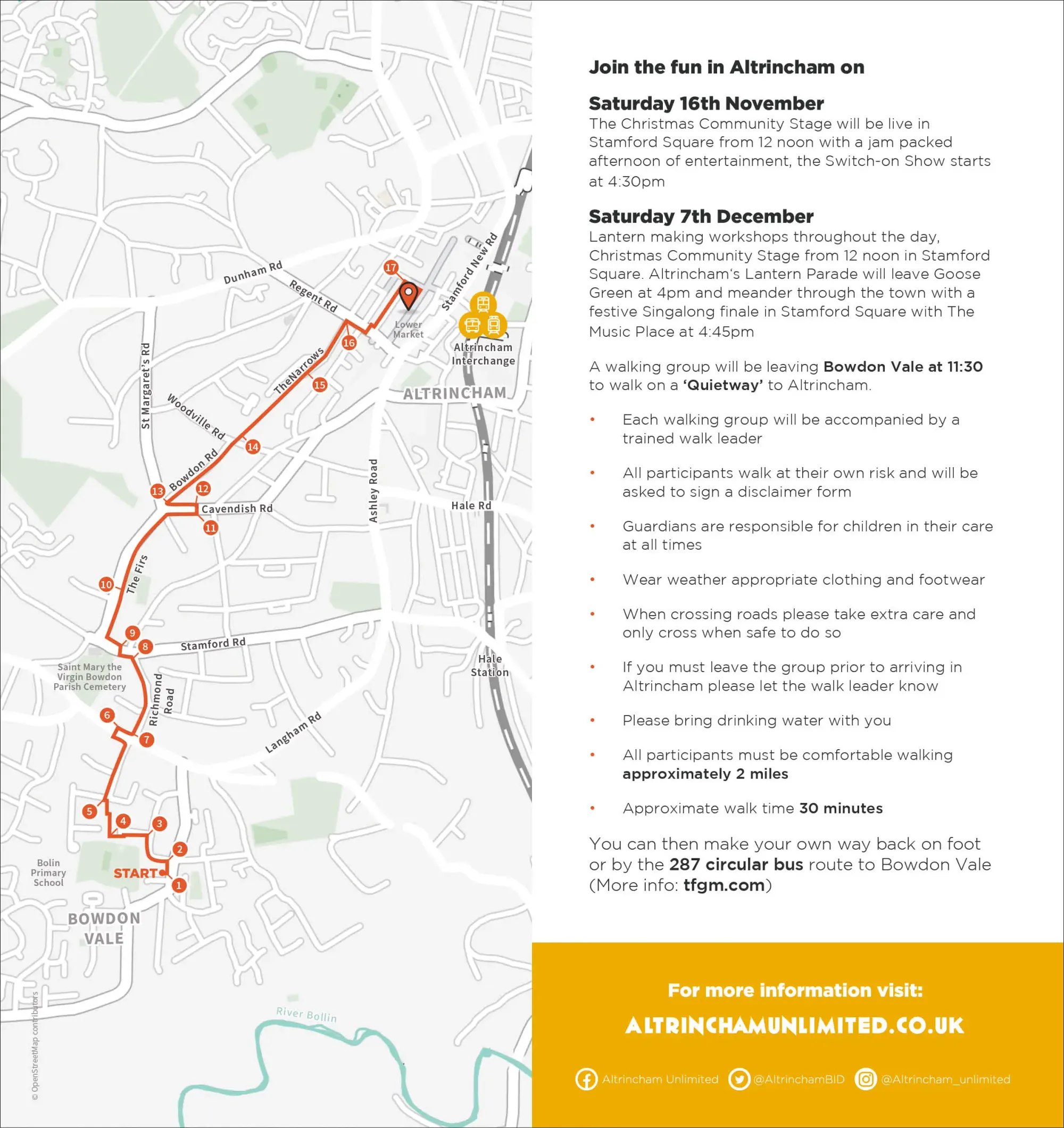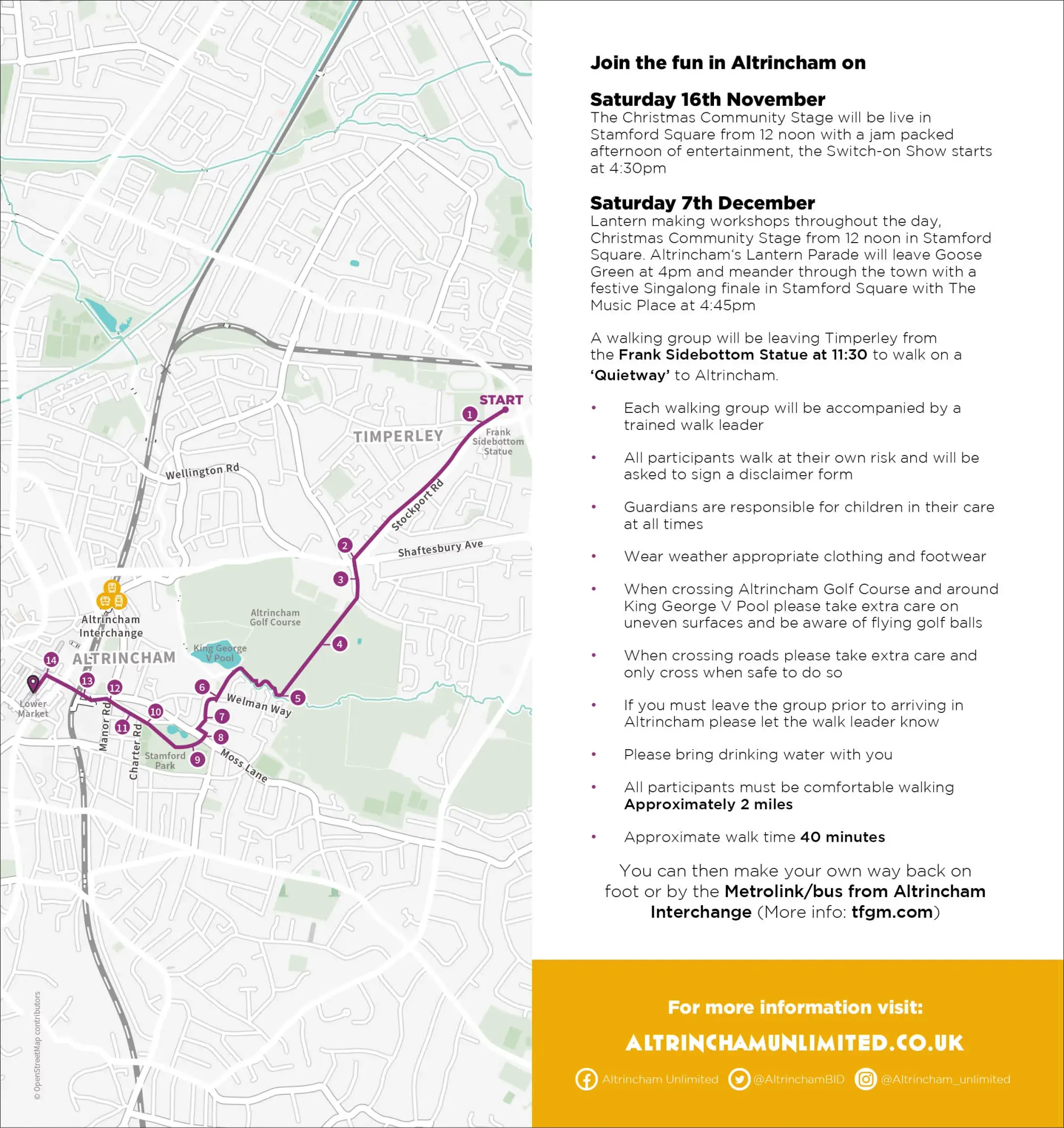 If you’re coming into Altrincham for the Christmas Lights Switch-on in Altrincham this Saturday, why not do the journey on foot as part of an organised walk?