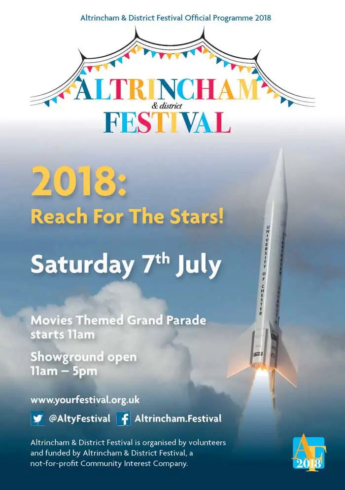 The parade will be led as usual by the Court Leet and followed by the amazing Starchaser Rocket, vintage and classic vehicles, Greater Manchester Police, two Samba bands, a bagpiper, and a variety of community groups, musicians and businesses. There will be a ‘Movies’ theme to this year’s parade.