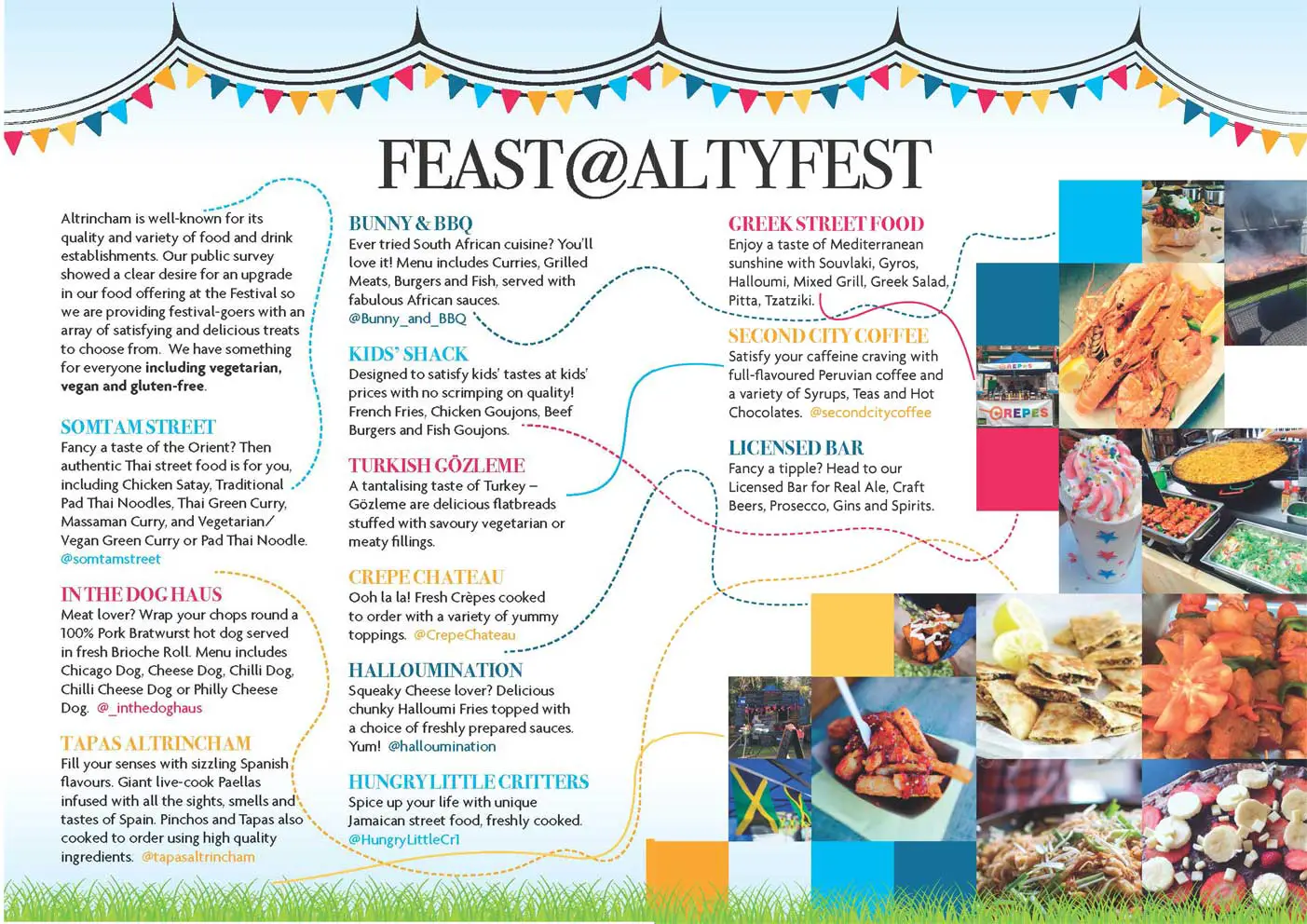 As part of Feast @ Alty Fest, there will be stalls from the likes of Somtam Street, In The Dog Haus, Tapas Altrincham, Kids’ Shack, Turkish Gozleme, Halloumination, Hungry Little Critters and Second City Coffee.