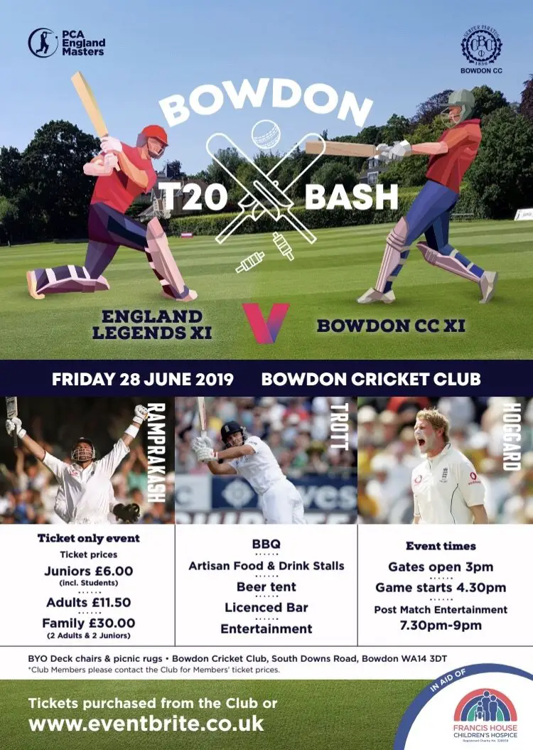 Event organiser and Chair of Bowdon Cricket Club Dominic Ball said: “This is a fantastic opportunity for the local community to come together and watch a great game of cricket involving some of England’s finest ex-cricketers whilst all the time raising money for Francis House. An absolute win-win in my view.”