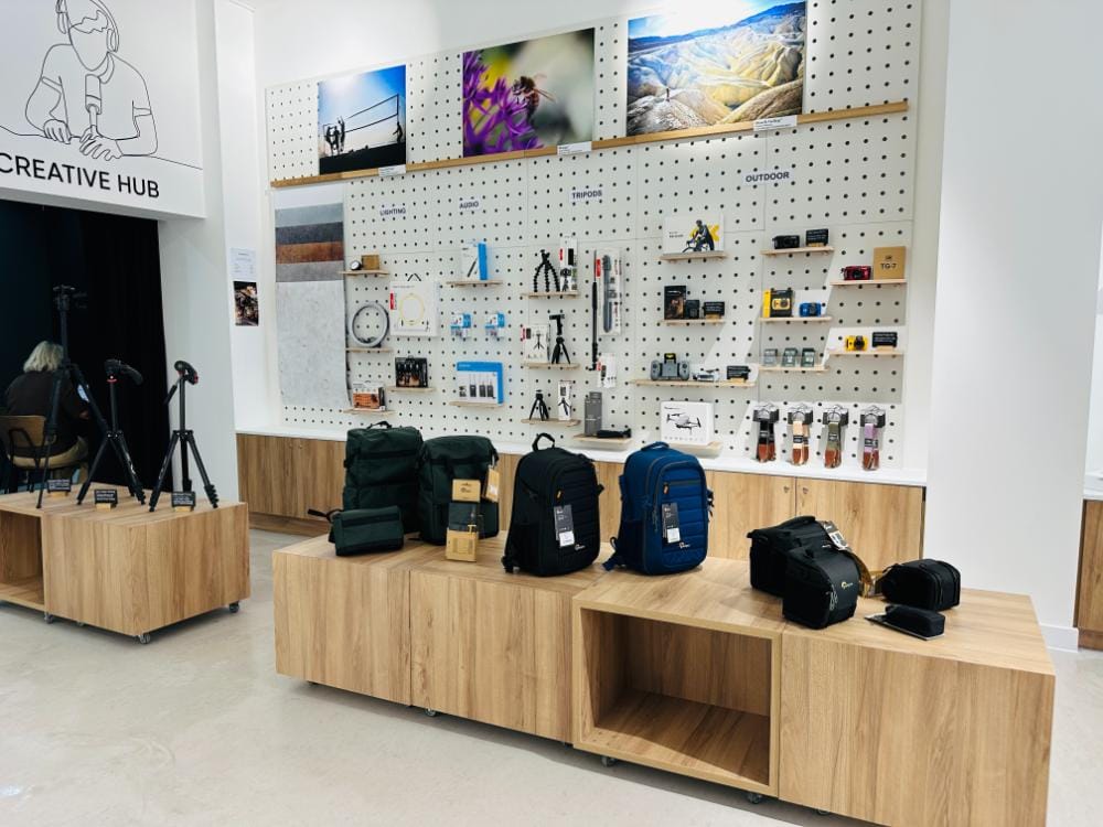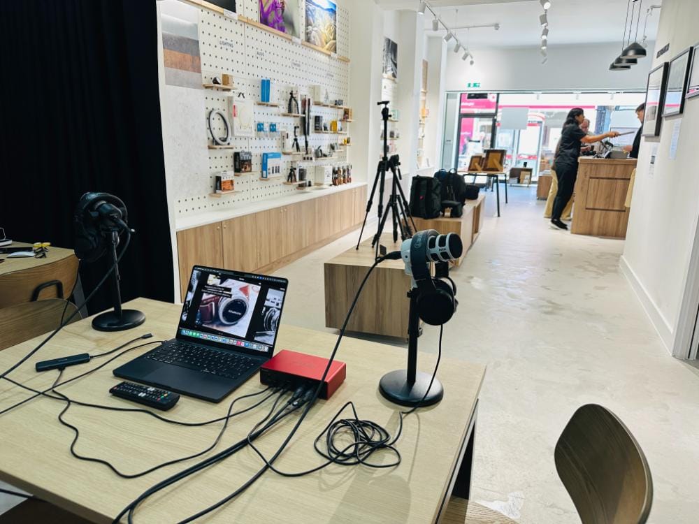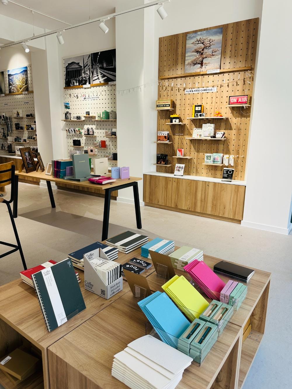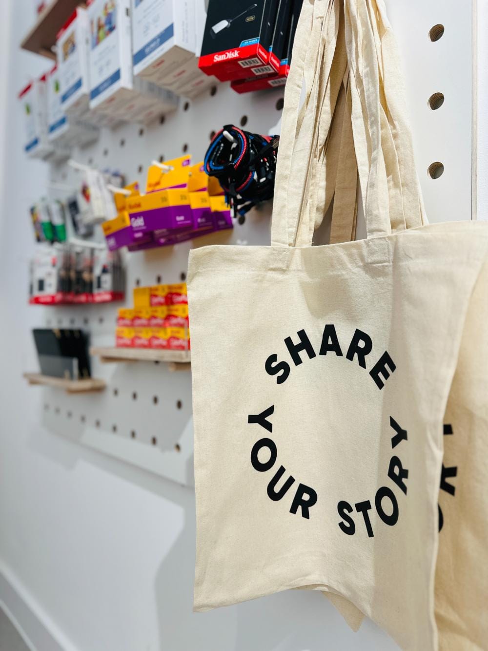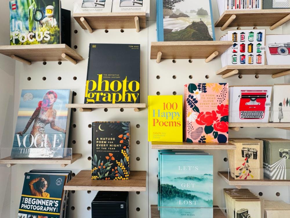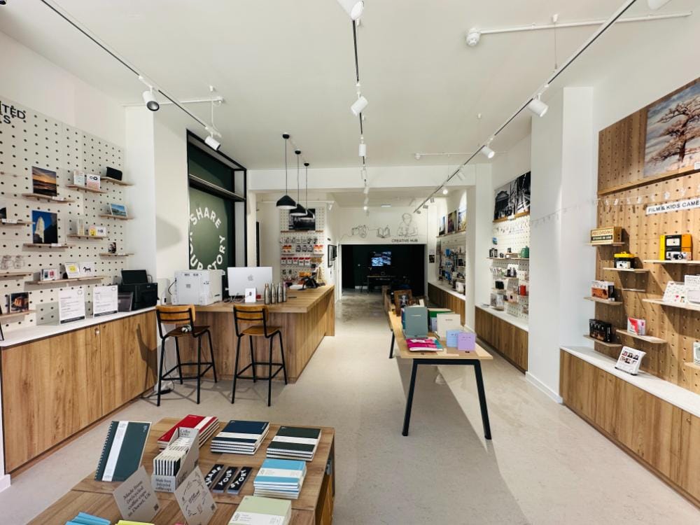 The bright, modern space features comfortable seating areas for workshops, displays of carefully curated equipment, and inspiration walls showcasing local stories. The retail section offers books, albums and creative supplies that complement the storytelling theme.