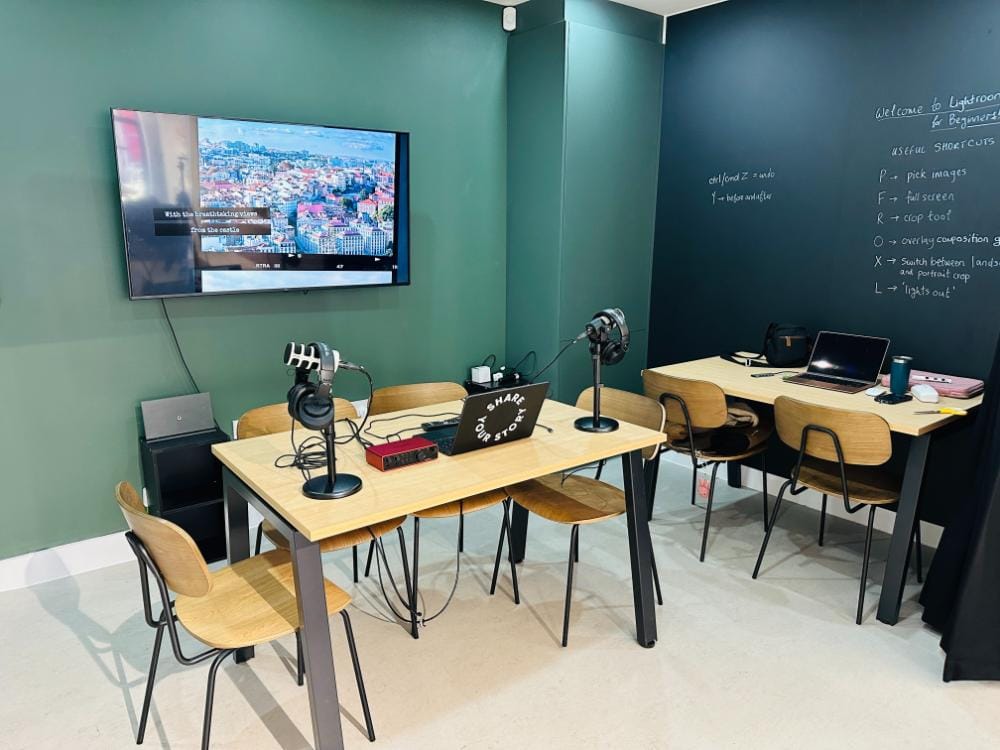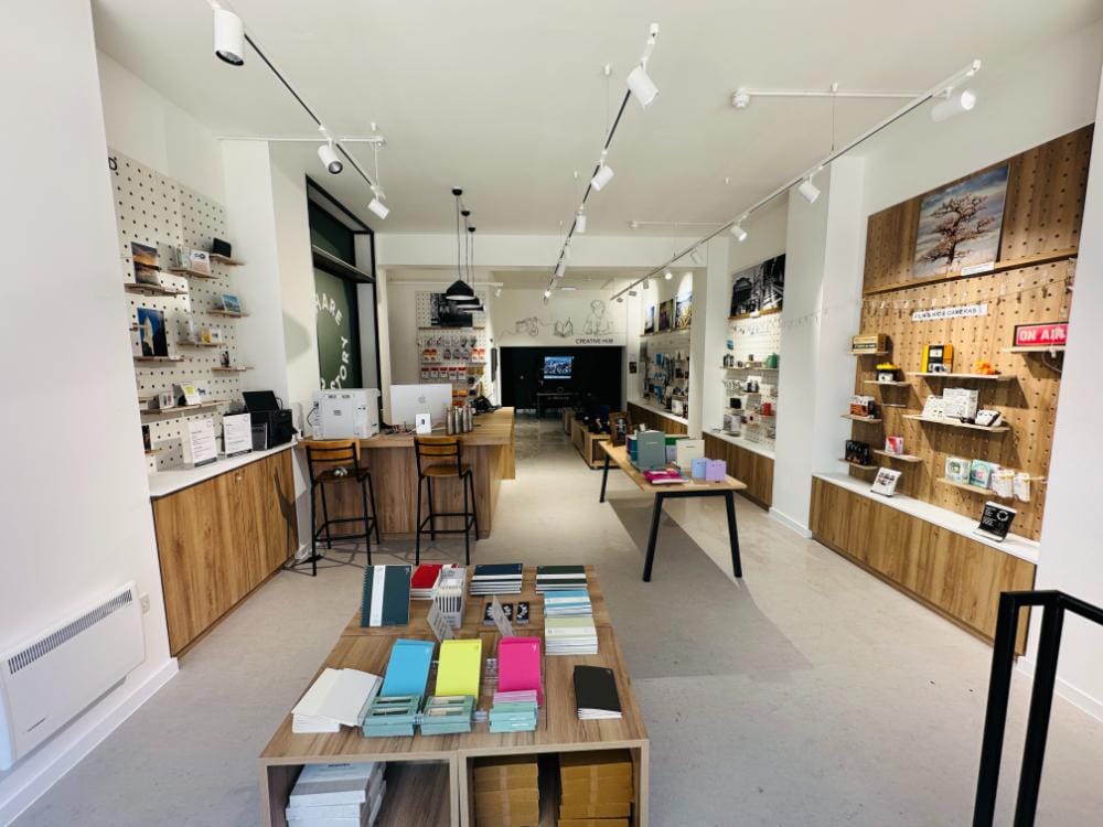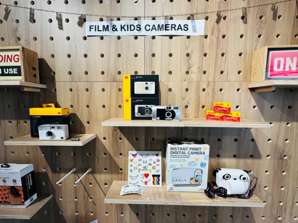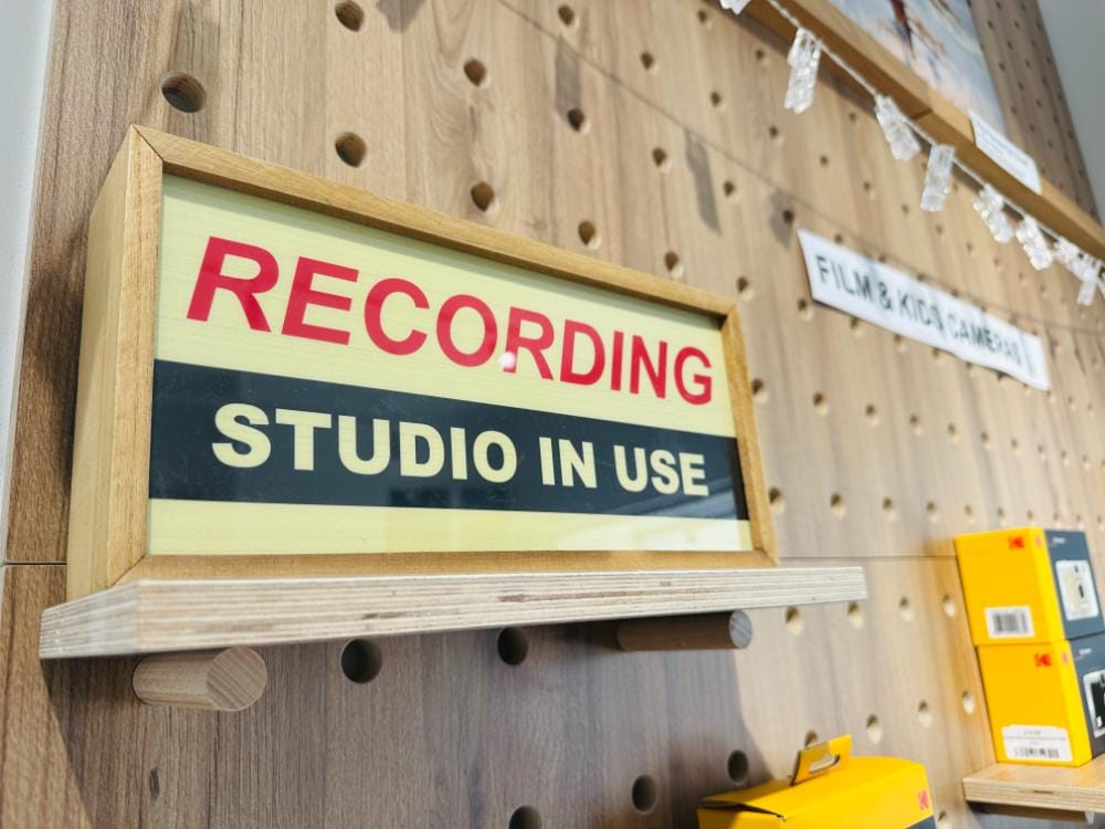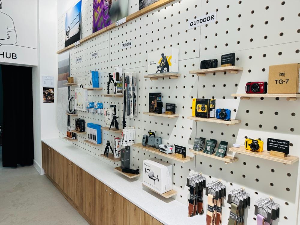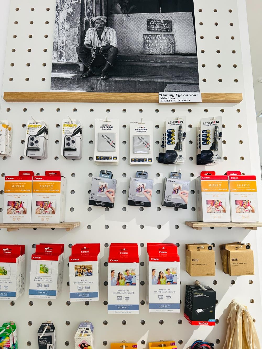 The bright, modern space features comfortable seating areas for workshops, displays of carefully curated equipment, and inspiration walls showcasing local stories. The retail section offers books, albums and creative supplies that complement the storytelling theme.