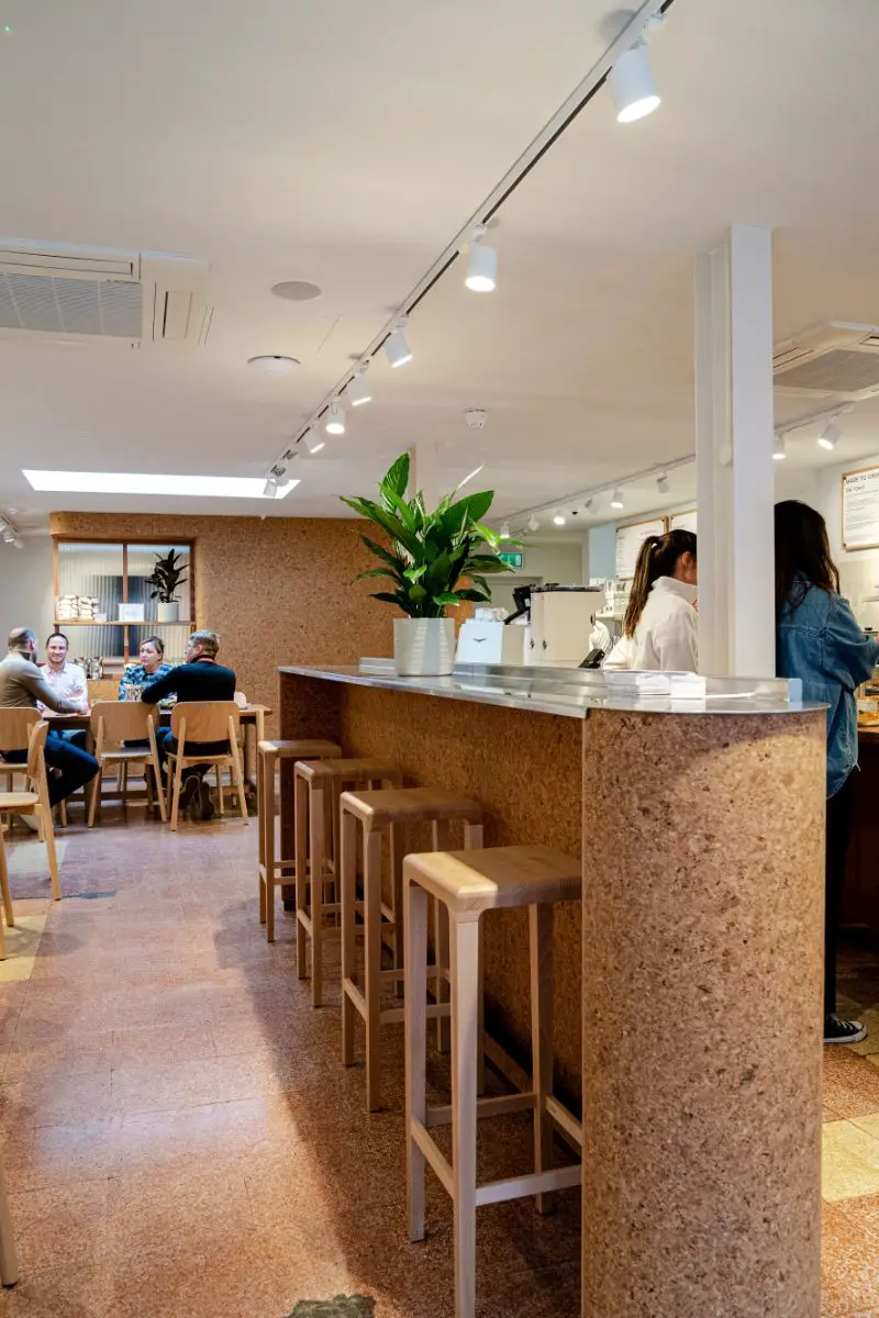 A sustainable approach has also been taken in the fit-out of the new Altrincham bakery, which has incorporated reused materials including the timber frontage, terrazzo floor and interior light fittings.