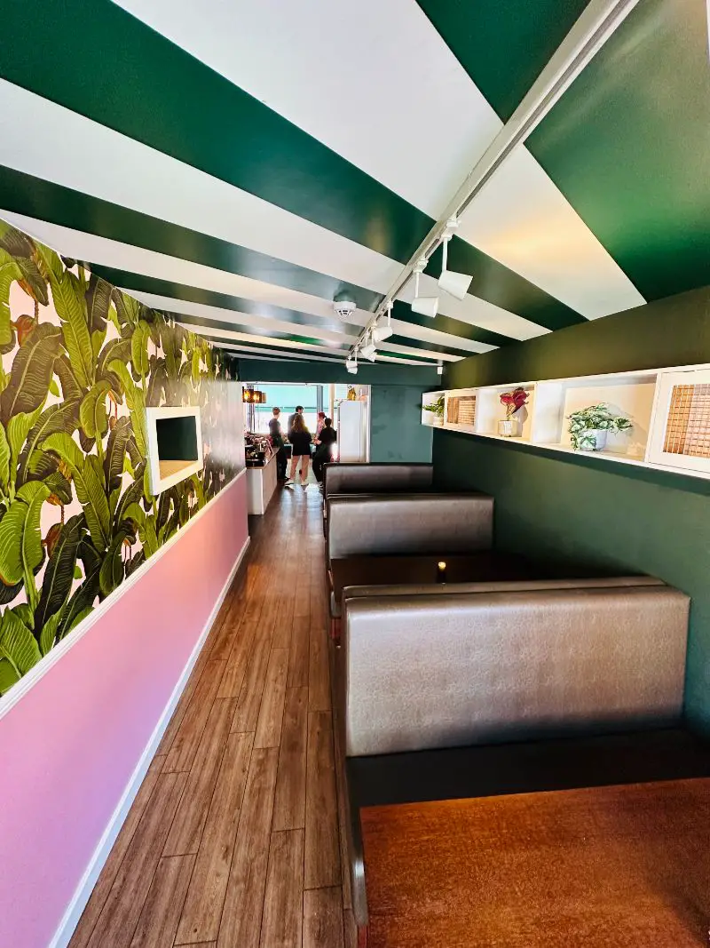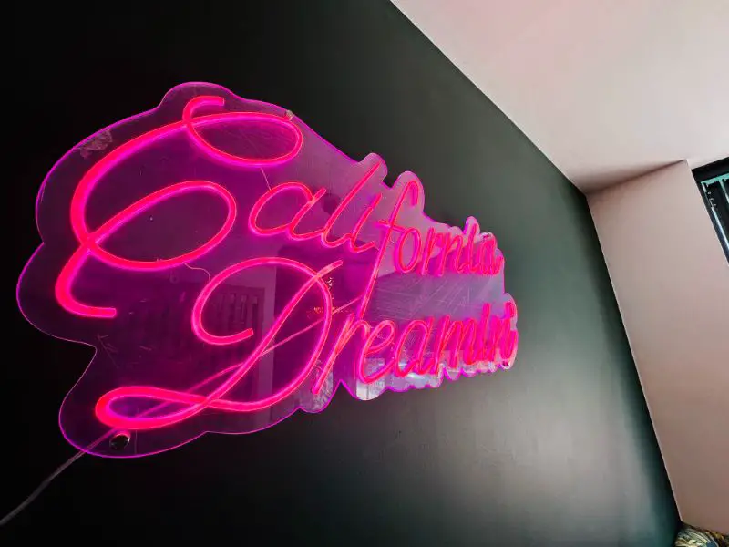 West Beverly, which appropriately enough will open to the public at 8am on Tuesday July 4th – Independence Day – continues the Californian theme, with statement wallpaper, pink walls, a white picket fence and a neon pink California Dreamin’ sign (similar to these custom neon signs).