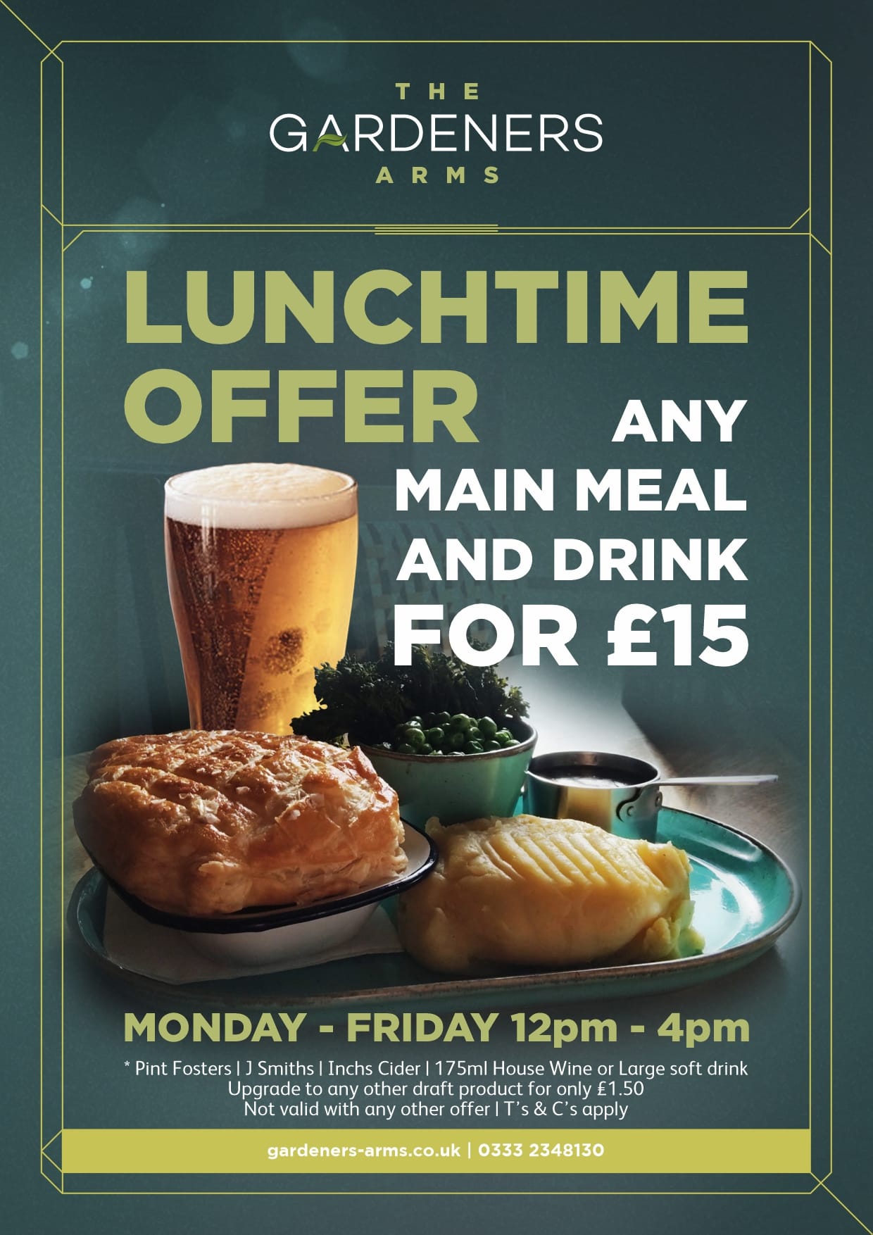 Main meal and a drink for £15, Monday to Friday, 12pm–4pm. Walk-ins welcome or book on 0333 234 8130.