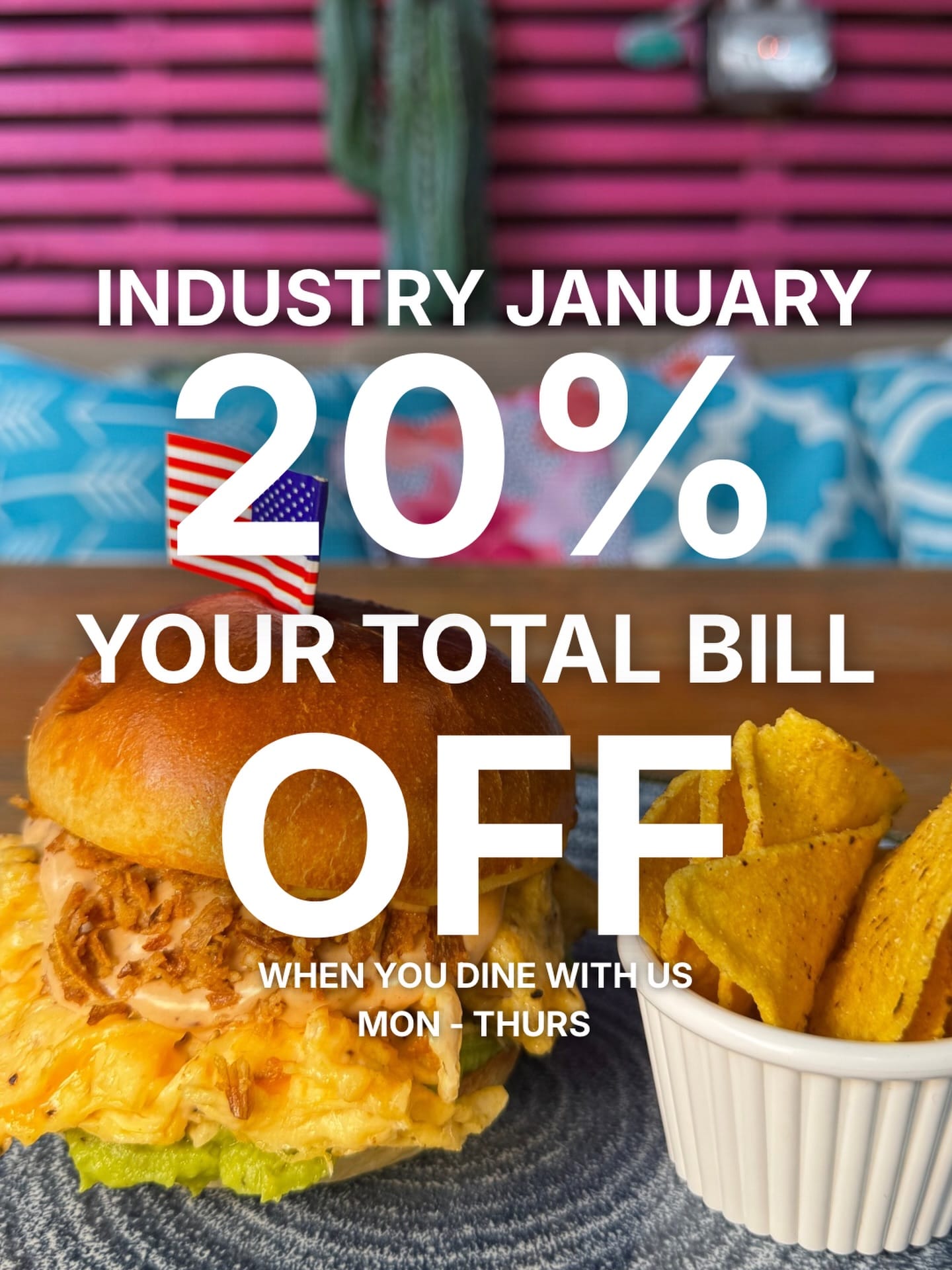 20% off your total bill, Monday to Thursday throughout January. Industry workers only. Food must be ordered and payslip required. Not valid with other offers or Happy Hour.