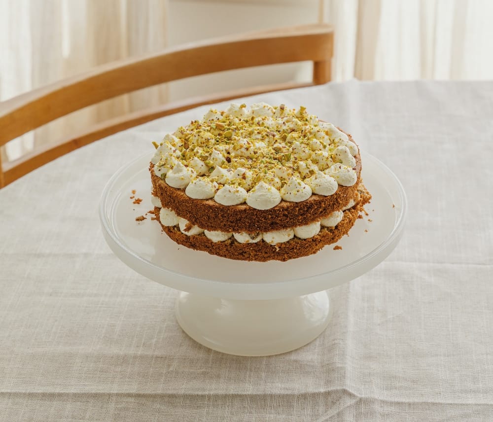 - Assemble: Spread or pipe the frosting over the cooled cake and sprinkle with crushed pistachios.
