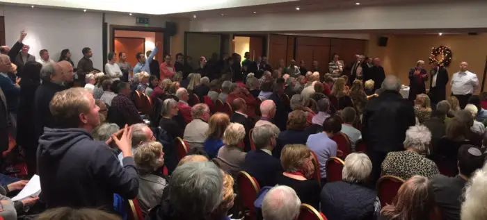 Below: The packed public meeting at the Marriott Hotel in Hale