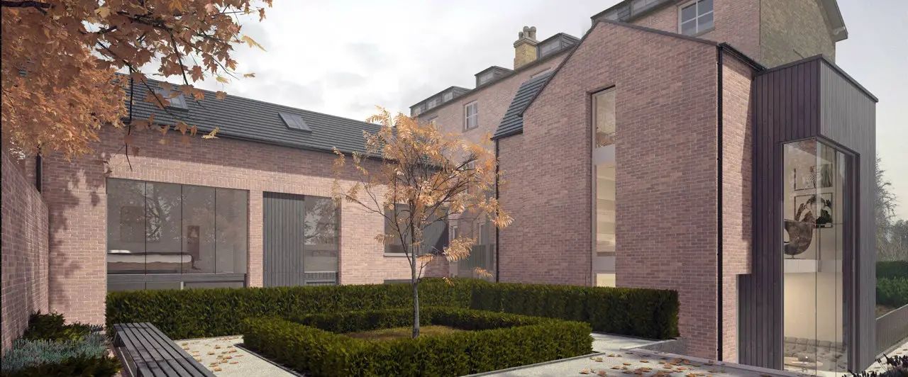 “New living accommodation is provided at the rear around a new formally landscaped courtyard which draws inspiration from the Victorian glasshouses which once occupied the site.”