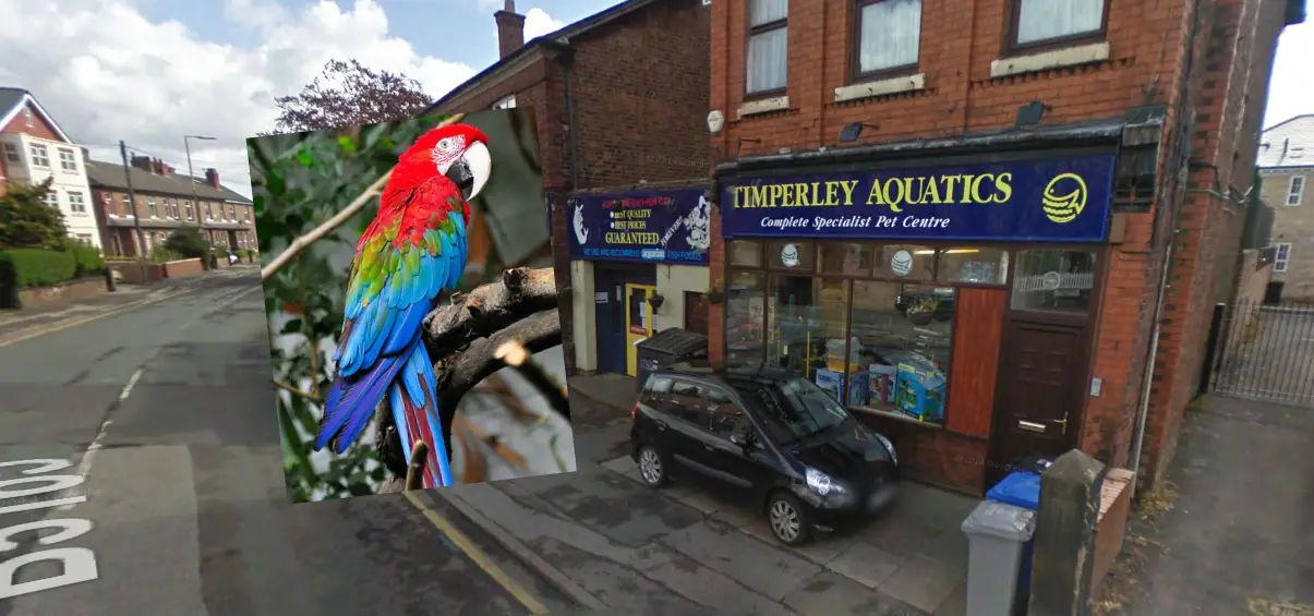 After attending the scene, police discovered the man had broken into Timperley Aquatics on Stockport Road, smashed the glass to the aviary with a wheelie bin and stolen a Green-winged Macaw.