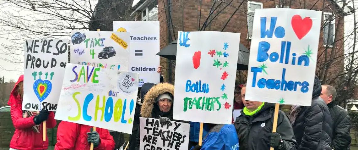 The protest at Bollin Primary School follows a petition signed by over 870 people that called for headteacher Michelle Brindle, who was appointed in September 2016, to be removed from the school.