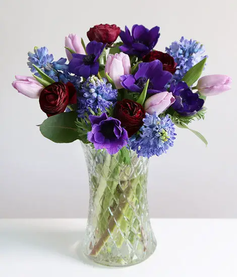 This bouquet is a symphony of blue and mauve tones and is the perfect bouquet to send to someone special who appreciates Spring flowers.