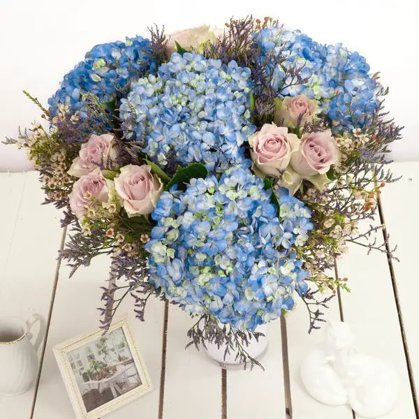 The Blue Hues bouquet is bursting with the cool colours of blue Hydrangea and Emile together with luxury lilac Roses and cream Waxflower.