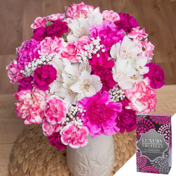 A gorgeous feminine bouquet including white Alstroemeria, two-tone pink and white Carnations, pink Spray Carnations and delicate white Gypsophila.