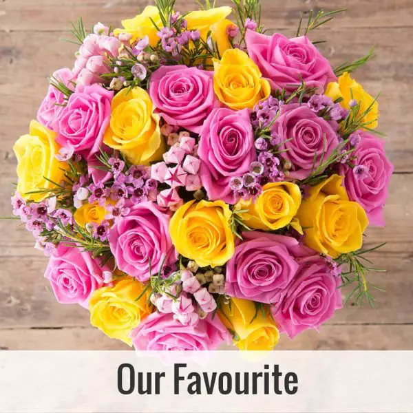 We love this gorgeous collection of blooms and it’s just perfect for celebrating mum this Mother’s Day. Golden yellow and perfect pink roses combine beautifully with bouvardia and wax flower – simply gorgeous!