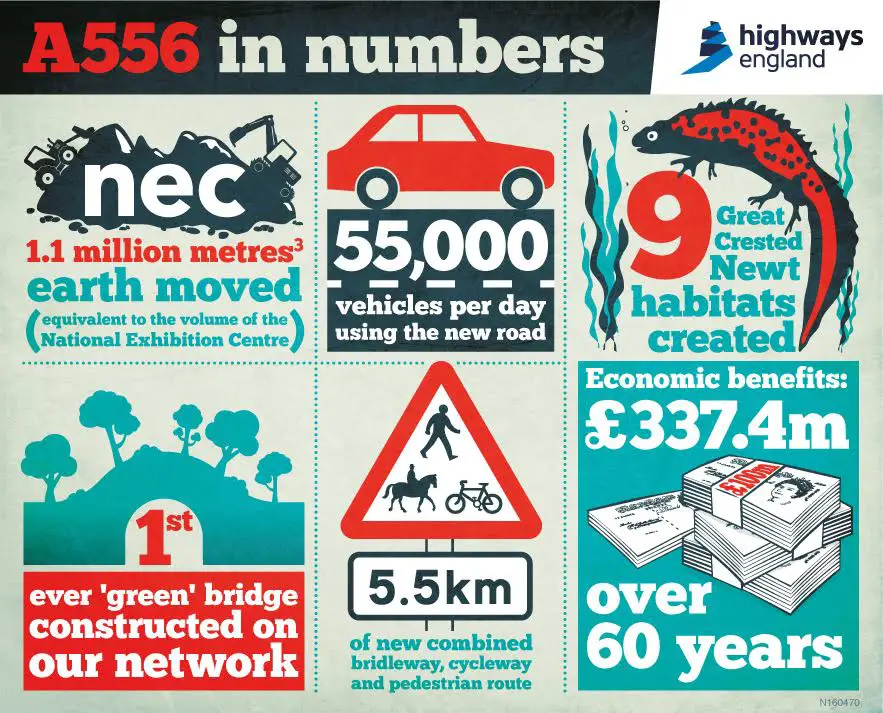 O’Sullivan said: “The A556 is a key strategic route linking the West Midlands and Cheshire to Greater Manchester and Manchester International Airport. The old road was heavily congested and compromised by busy crossroads. This new road, built to modern standards, will provide faster and more reliable journeys between the two motorways – benefiting commerce and commuters alike.