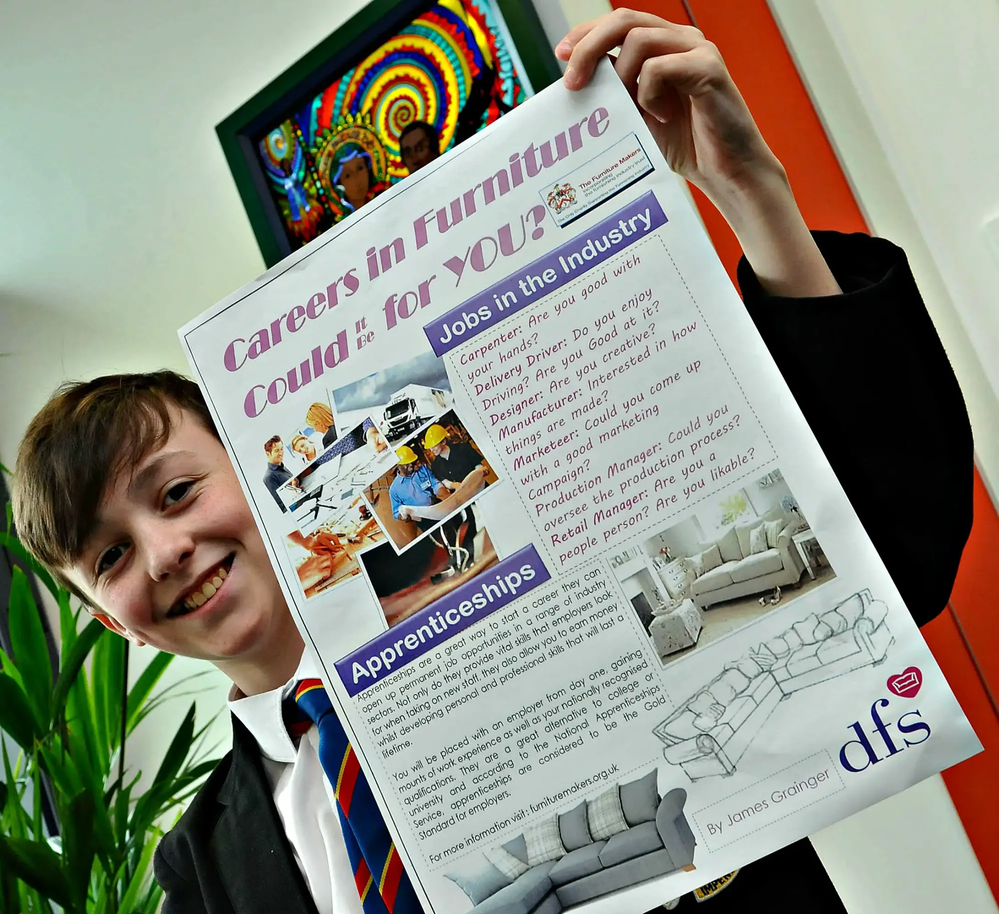 James, who is studying Design Technology as one of his 10 GCSEs and hopes to continue the subject at A Level, said: “The brief was to show just how many jobs are available in the furniture industry demanding both practical and highly creative skills and I hope I got the message across of the great choice young people like me have when they leave full time education.”