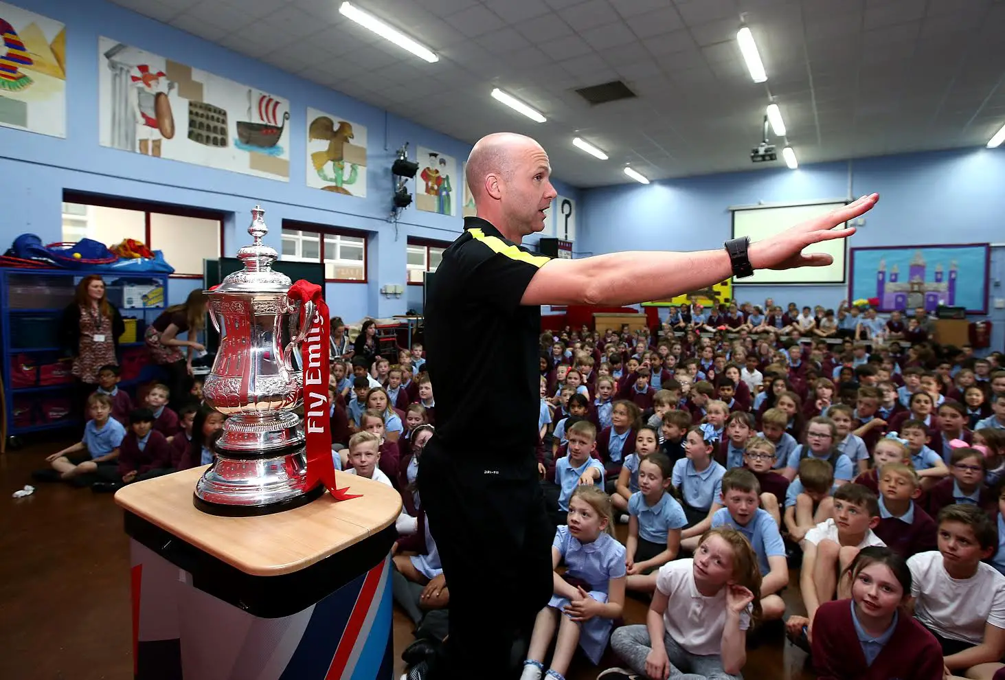 Anthony Taylor, who will be refereeing the showpiece clash between Arsenal and Chelsea at Wembley on Saturday 27th May. visited Heyes Lane Primary School.