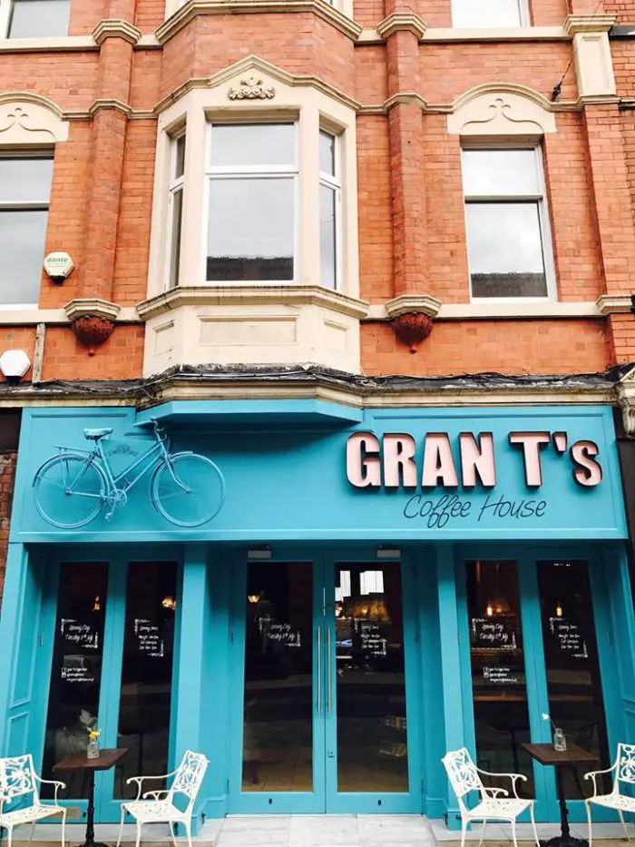 Gran T’s coffee house, 29 Stamford New Road, Altrincham, WA14 1EB. Opening hours: Mon to Fri 7am-9pm, Sat 8am to 6pm, Sun 9am to 5pm.