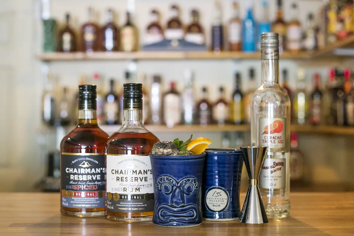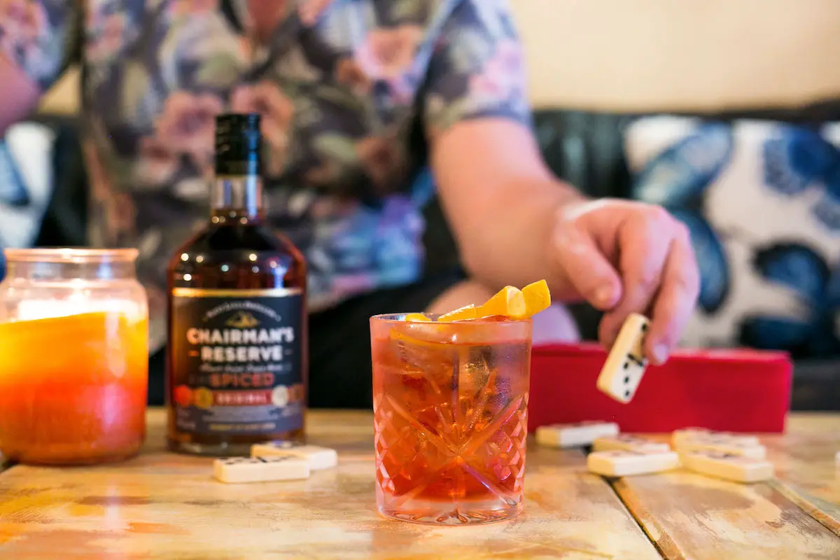 It combines Chairman’s Reserve Spiced rum, John D. Taylor’s Velvet Falernum (a Barbados based lime liqueur) and Campari for a blended twist on the gin classic. It balances the fresh spices of the rum, the bitterness from the Campari and the sweeter profile from the Velvet Falernum.