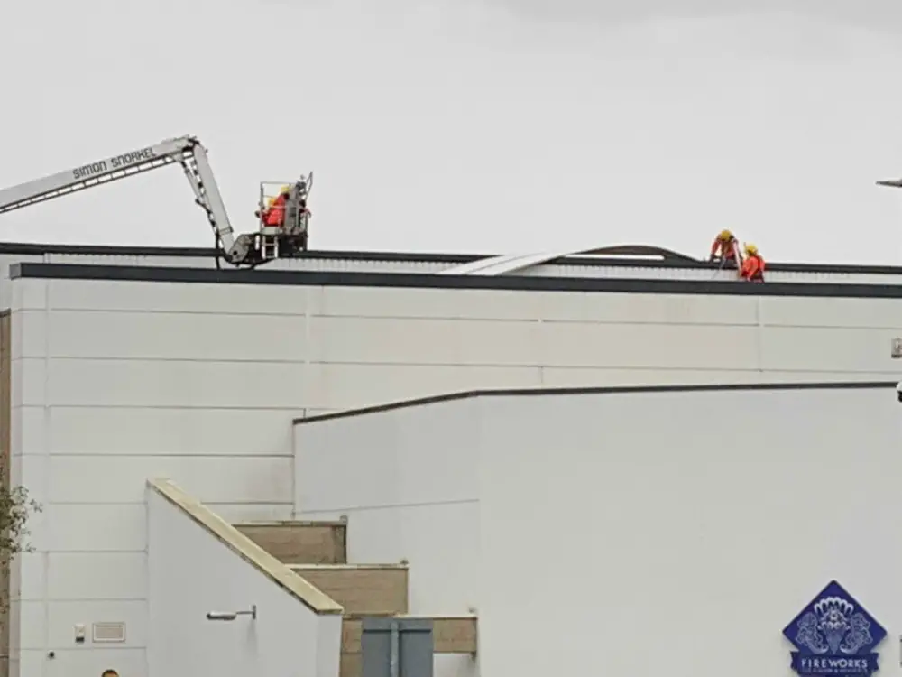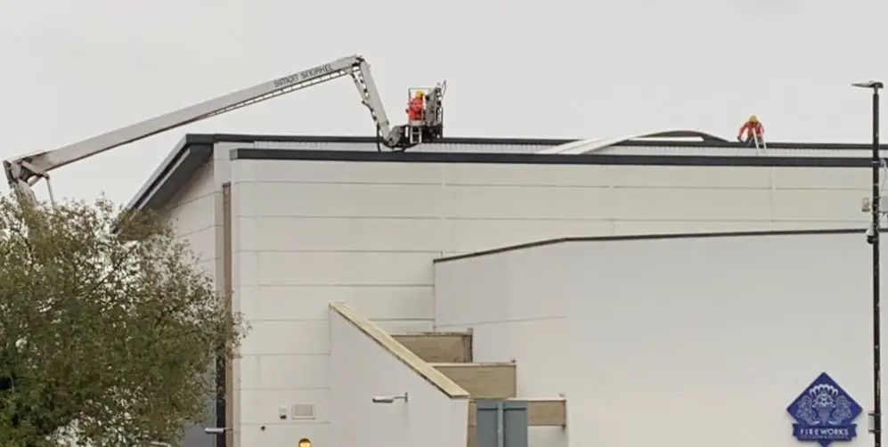 Six large corrugated metal sheets have since been found to be detached from the roof, and the fire service is currently working at the scene to make the area safe.