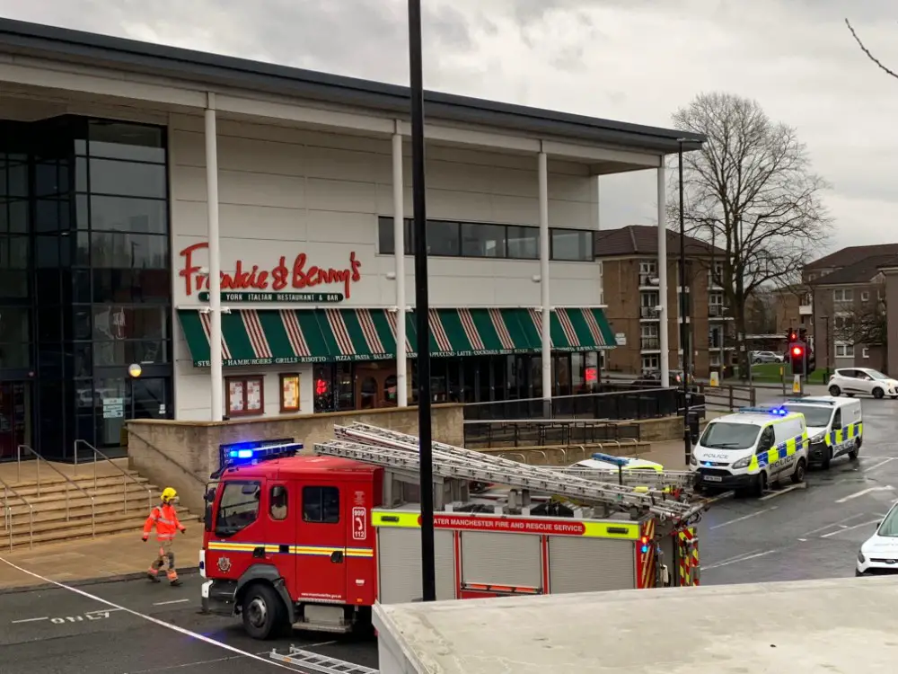 Video from the scene on Denmark Street as the fire service attempt to make the roof safe. The entire area around the Vue Cinema, Goose Green and Tesco is currently cordoned off #Altrincham pic.twitter.com/Y2JOgqqWMh