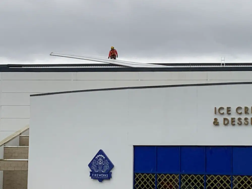 A large piece of the roof has just been detached from the roof of the Vue Cinema on Denmark Street #altrincham pic.twitter.com/1H3JkDAqgt