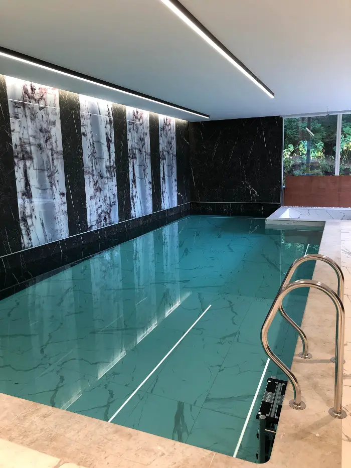 The interior of the property was gutted and completely redeveloped and the building extended with a large single storey leisure suite incorporating a gym, sauna and media room, linked to the original house via a glass corridor.