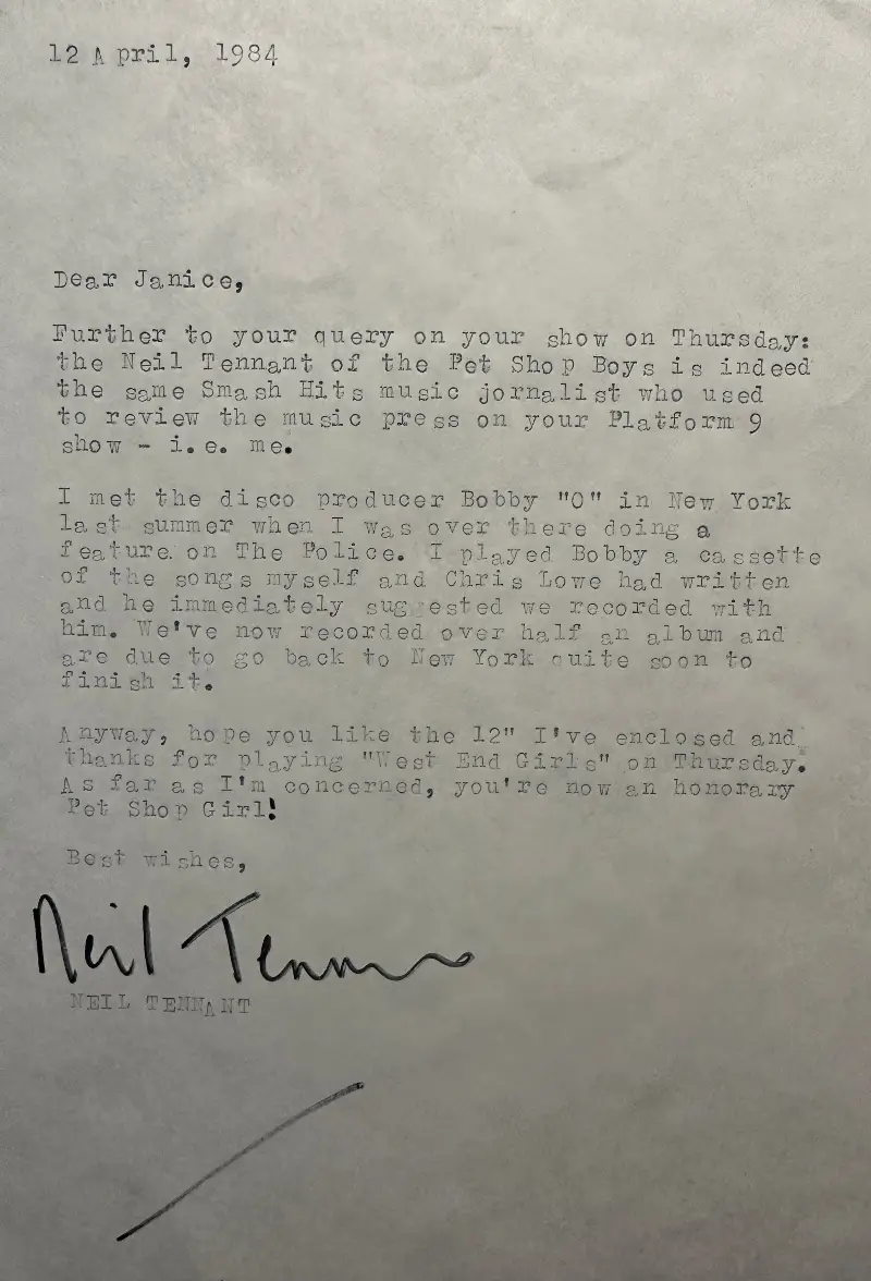 Anyway, hope you like the 12” I’ve enclosed and thanks for playing “West End Girls” on Thursday. As far as I’m concerned, you’re now an honorary Pet Shop Girl!