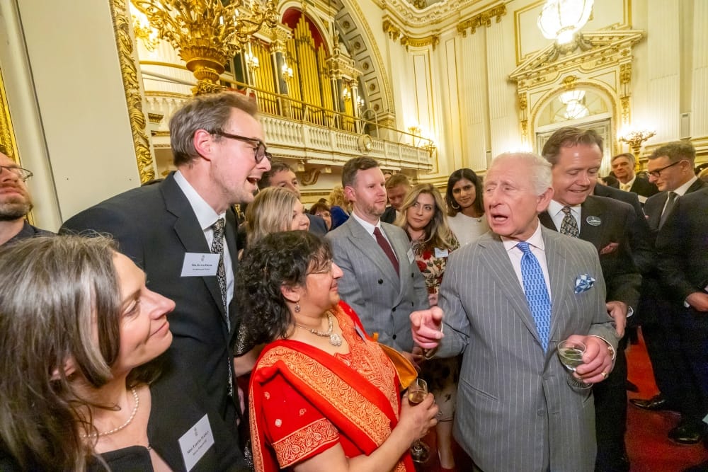 The reception was held in the main ballroom at Buckingham Palace, where the King, Queen and the Duke and Duchess of Gloucester mingled with the media and enjoyed Champagne and canapés.