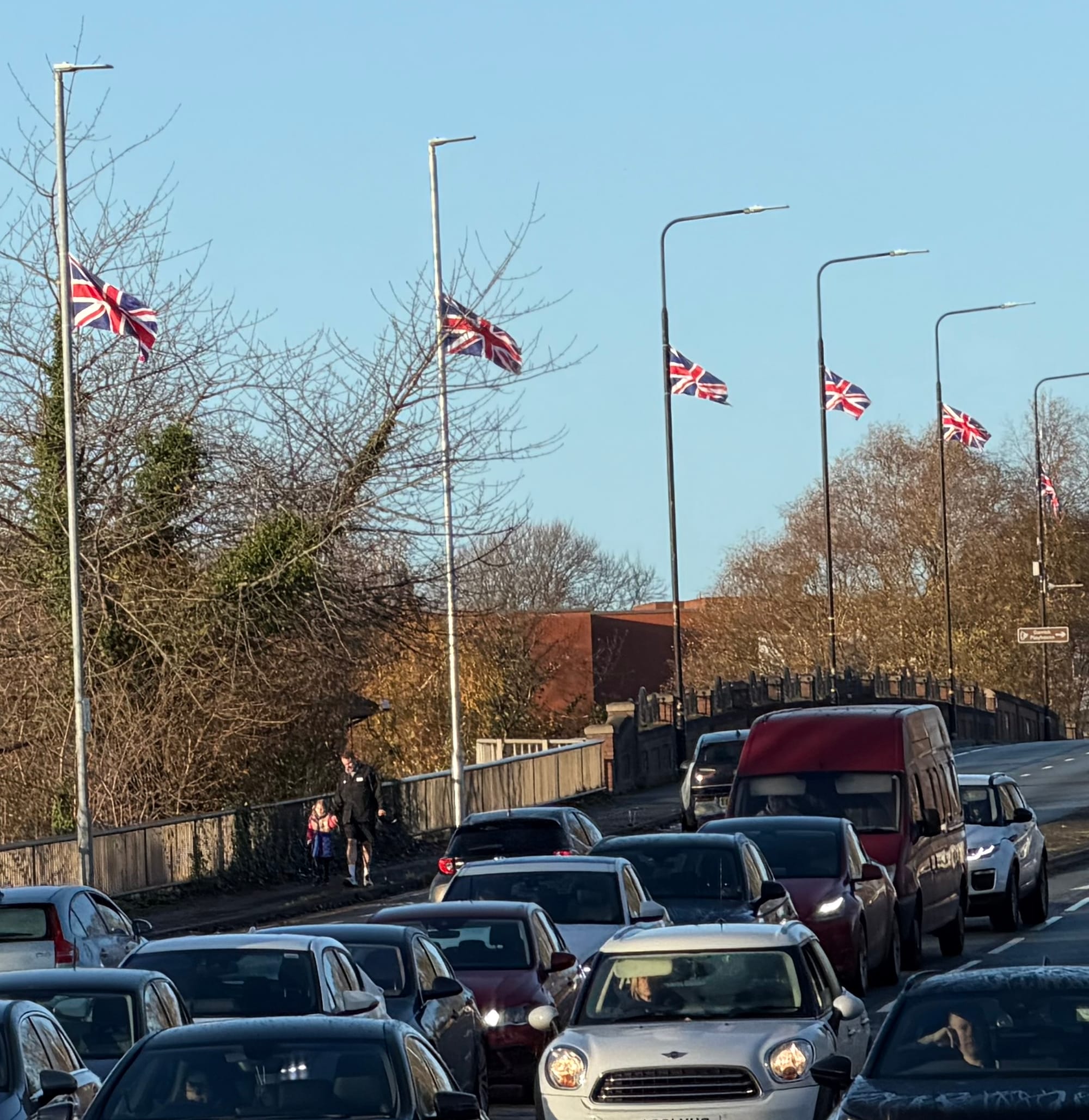 The flags are believed to have been mounted during the early hours of Saturday, 8th November, along both sides of Woodlands Road and the flyover section down to Stockport Road.