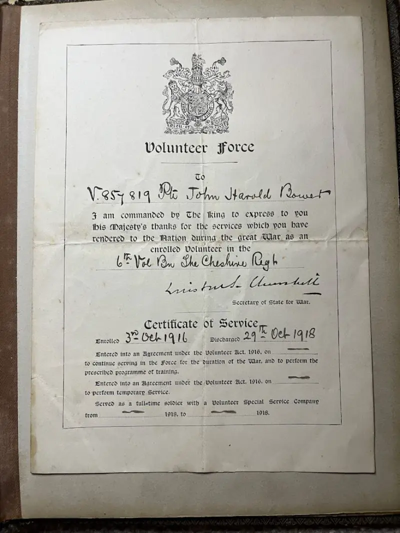 Among the items is a First World War certificate of service for Private John Harold Bower, who was in the Cheshire Regiment between 1916 and 1918.