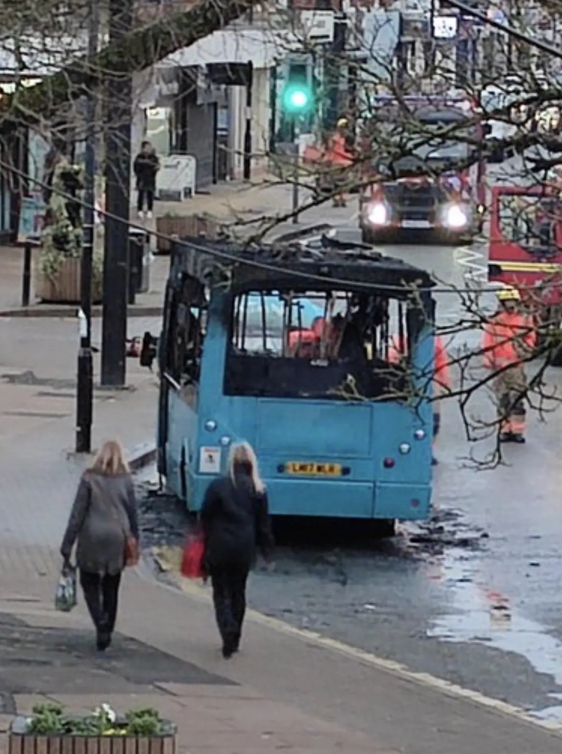 Local residents, businesses and commuters watched in astonishment as flames started emerging from the dashboard of the blue bus at around 8.30am this morning.