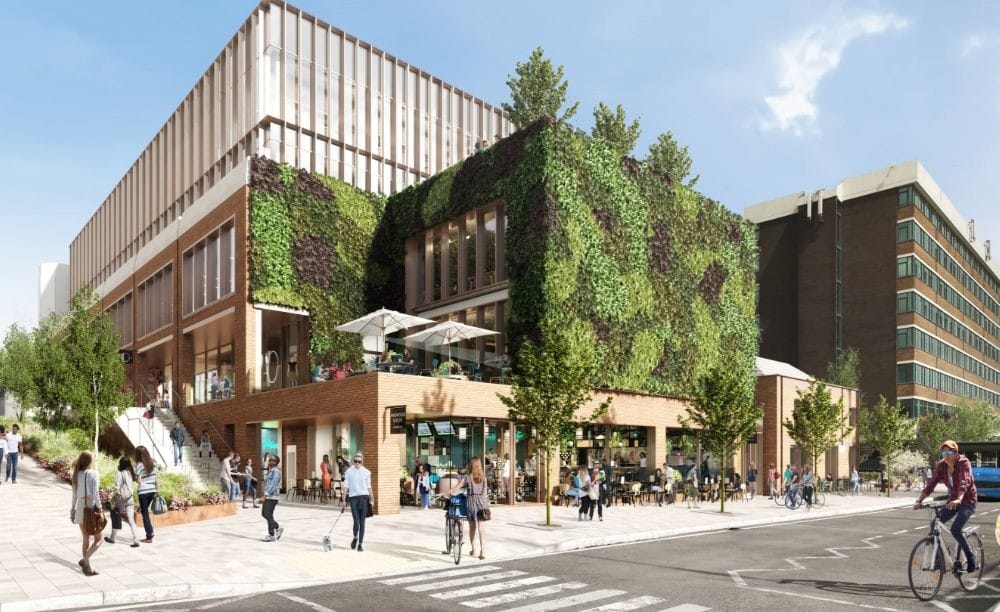 The transformative development will include a 375 sq m living biophilic wall on the building’s external façade, made up of 36,000 carefully selected plants grown by local firm I Want Plants, reducing the building’s carbon emissions and creating a habitat for wildlife.