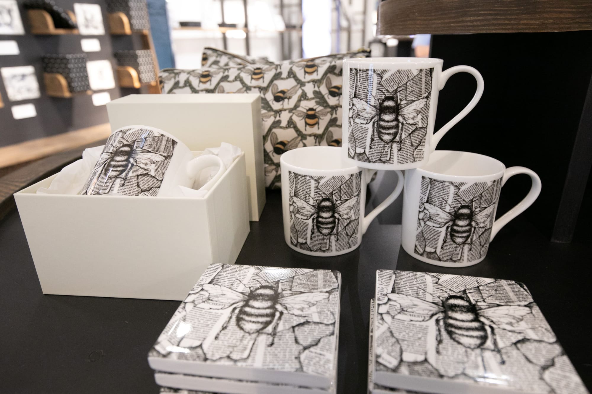 Products include greetings cards, prints, textiles, mugs and its signature ‘alphabet tiles’, with each letter accompanied by a hand-drawn illustration of a part of Manchester’s heritage, from the Worker Bee to Stephenson’s Rocket and Factory Records.