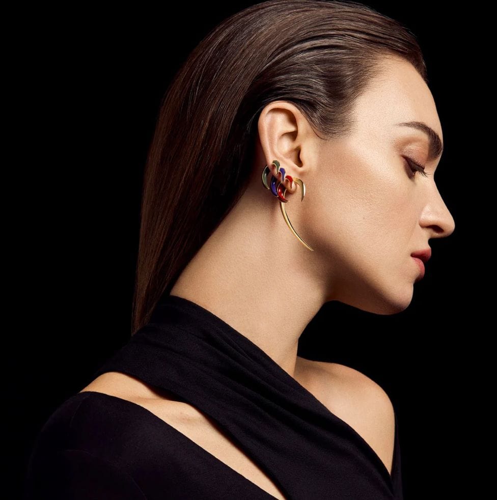 Shaun Leane Sabre Solis Talon Earrings are handcrafted from yellow gold vermeil and leaf-coloured ceramic. Fantastically shaped, glistening curves terminating in a sharp point. Edgy, cool and British jewellery at its best.