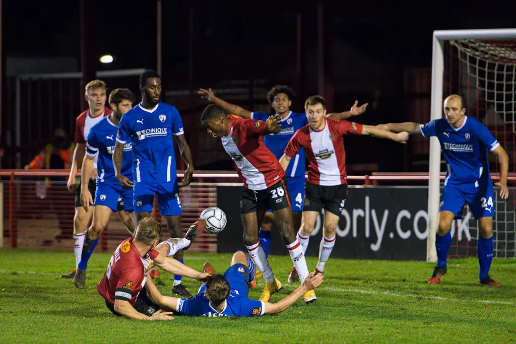 But after 13 minutes it felt like Groundhog Day – the hosts found themselves behind once again. After Chesterfield’s initial shot, which was blocked by Altrincham loanee Billy Sass-Davies, the ball fell kindly to the head of Jonathan Smith. The Spireites midfielder threaded the loose ball across goal to find Scott Boden who, left unmarked, duly headed the ball into the back of the net.