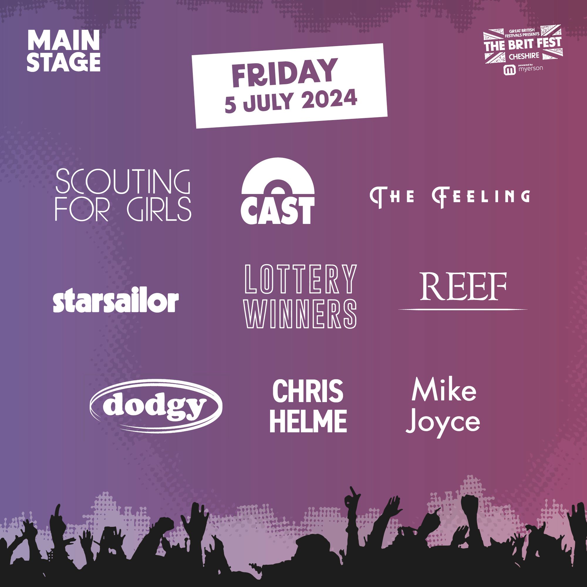Opening the festival on Friday 5th July will be Scouting for Girls, Cast, The Feeling, Starsailor, Lottery Winners, Reef, Dodgy, Chris Helme and Mike Joyce.