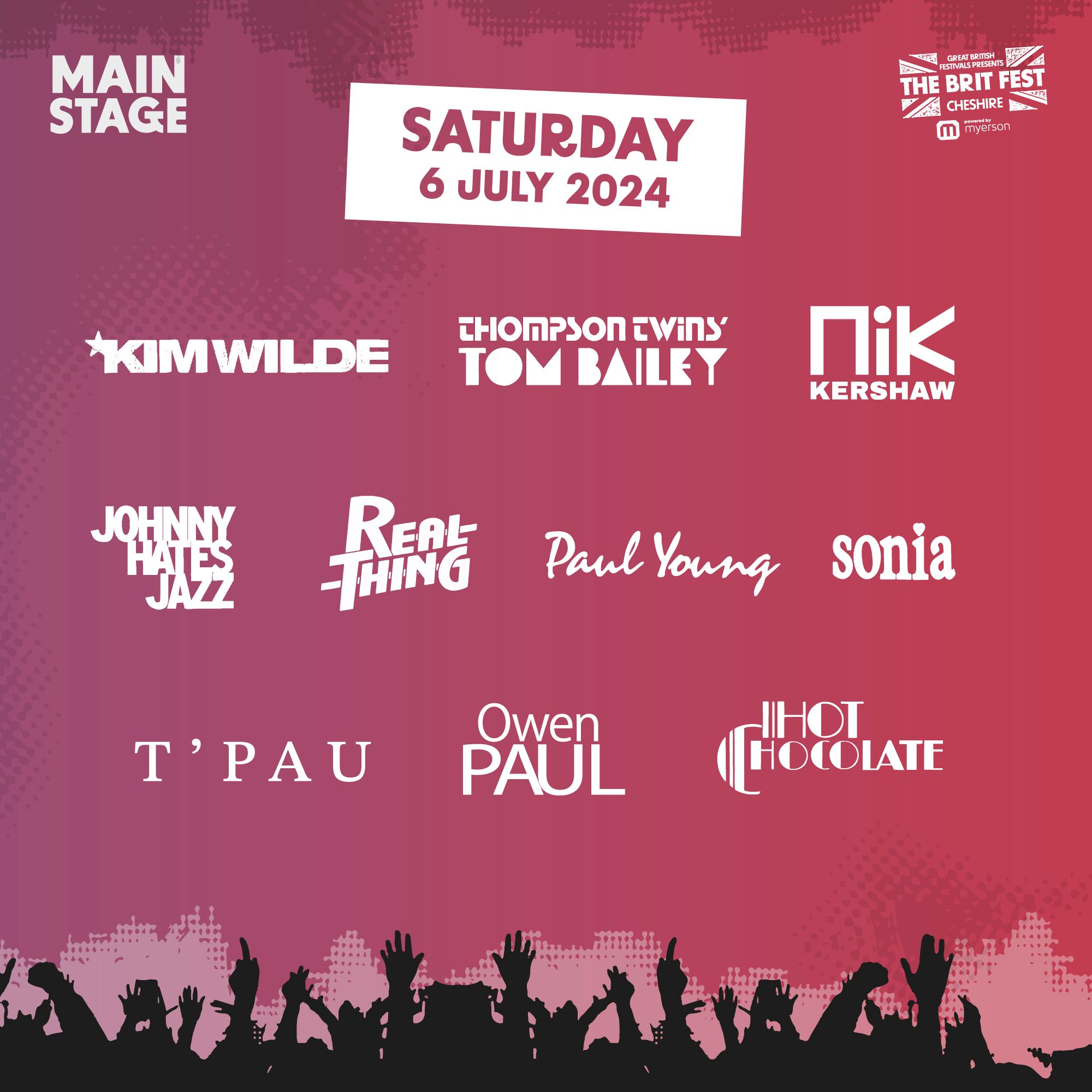 On Saturday 6th July, you can see Kim Wilde, Thompson Twins' Tom Bailey, Nik Kershaw, Johnny Hates Jazz, Real Thing, Paul Young, Sonia, T’Pau, Owen Paul and Hot Chocolate.